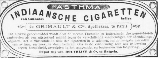 Advertisement for cannabis cigarettes, sold in pharmacies in Batavia as medicine for asthma and other respiratory disorders / Bataviaasch handelsblad, 1876