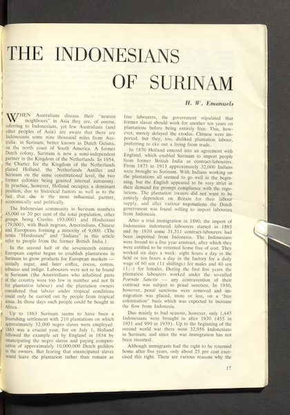 Pak Emanuels finally managed to return to the country of his birth for a short visit in 1959 and wrote an article for the journal Hemisphere entitled ‘The Indonesians of Surinam’ (December 1963).