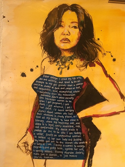 Sebuah lukisan karya seniman Molly Crabapple, dari serangkaian lukisan perempuan Amerika dan Indonesia yang pernah melakukan aborsi. Gaun dan kata-kata oleh Eliza Vitri Handayani / Jin Panji dengan izin